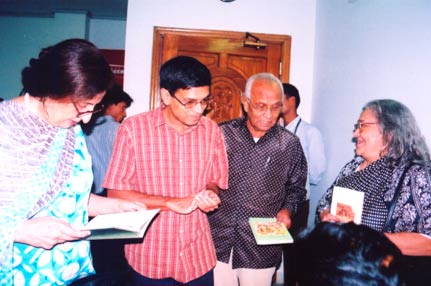 Syed Badrul Ahsan reading from Syed Najmuddin Hashim's Hopefully the Pomegranate. Others in the picture are Mrs Hashim, Jharna Rahman, and Niaz Zaman.